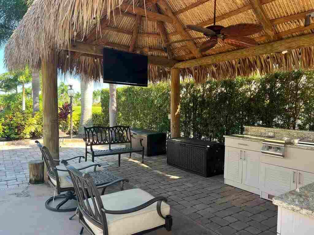 This waterfront lot is conveniently located only a short walk from the Clubhouse which is the location for all the organized socials and entertainment events. Located behind the Clubhouse are the main pool and spa, tennis and pickle ball courts as well as bocce ball and shuffle board. This cozy tiki is complete with TV, cook top, refrigerator and furniture which makes it the perfect place to unwind and relax or entertain new found friends.
