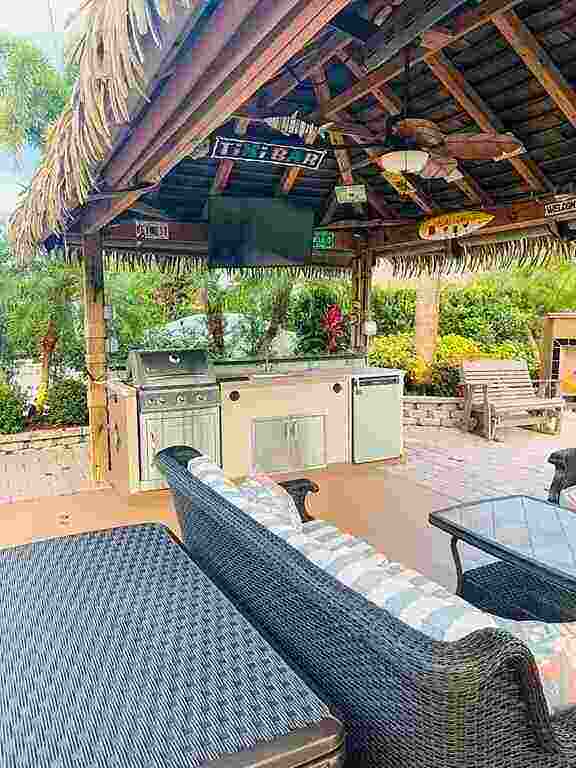 The large tiki features a premium gas grill, single bar sink with hot and cold water, compact refrigerator, overhead fan, mounted outdoor heaters. Enjoy a meal or your favorite beverage while watching a show or or favorite sporting event on a 50' outdoor flatscreen smart TV .Overhead accent lighting at the top of the tiki, bottom of the outdoor kitchen and on each post of the tiki hut so you can adjust the lighting to the occasion, whether it be a dim candle light dinner or bright for entertaining guest. The tiki hut has a drop down privacy screens that can be lowered to reduce the sun, wind, rain or cold, yet still preserve the view of the golf course and pond. The decorative fireplace provides a beautiful glow to llight up the sitting area directly in front of the gold course. The perfect combination for the entire year!